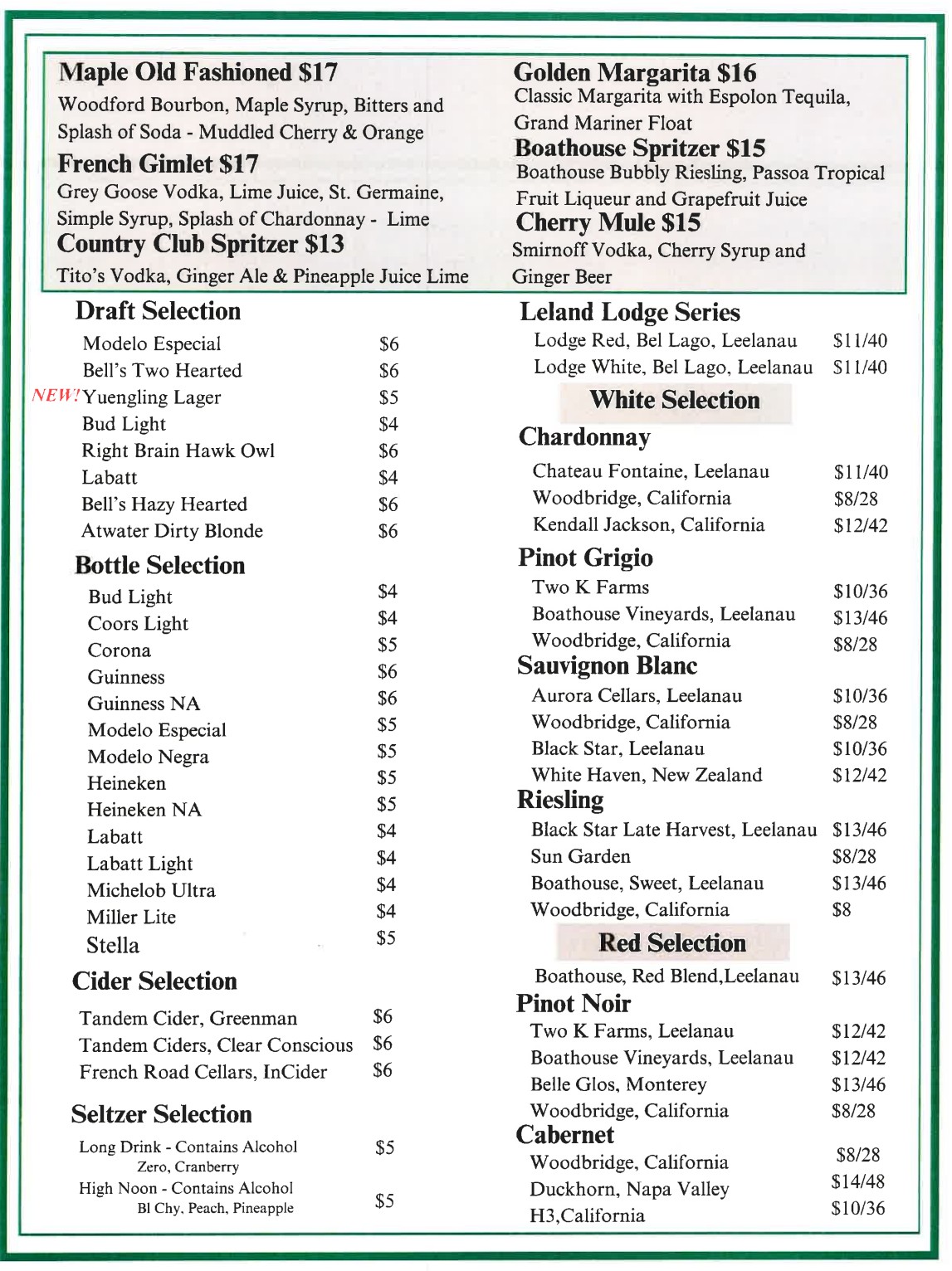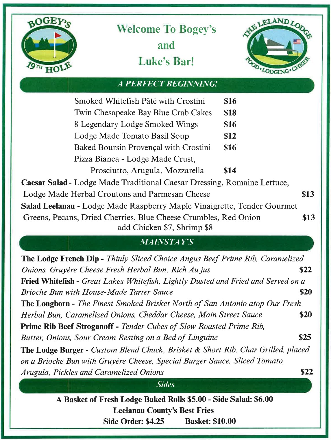 A long-time favorite of locals, tourists, and cottagers, Bogey’s 19th Hole is a year-round, golf-themed restaurant and bar overlooking the 8th fairway of the golf course. Bogey’s offers a casual ambiance with an upscale sports bar vibe. Under the watchful eye of Luke Weisen, Leland’s friendliest bartender, Bogey’s featured menu items include The Lodge Burger, Pizza Bianca, The Longhorn brisket sandwich, and an assortment of salads, appetizers, salads, and soups. A children’s menu is also available. Bogey’s has both indoor and outdoor (seasonal) seating.