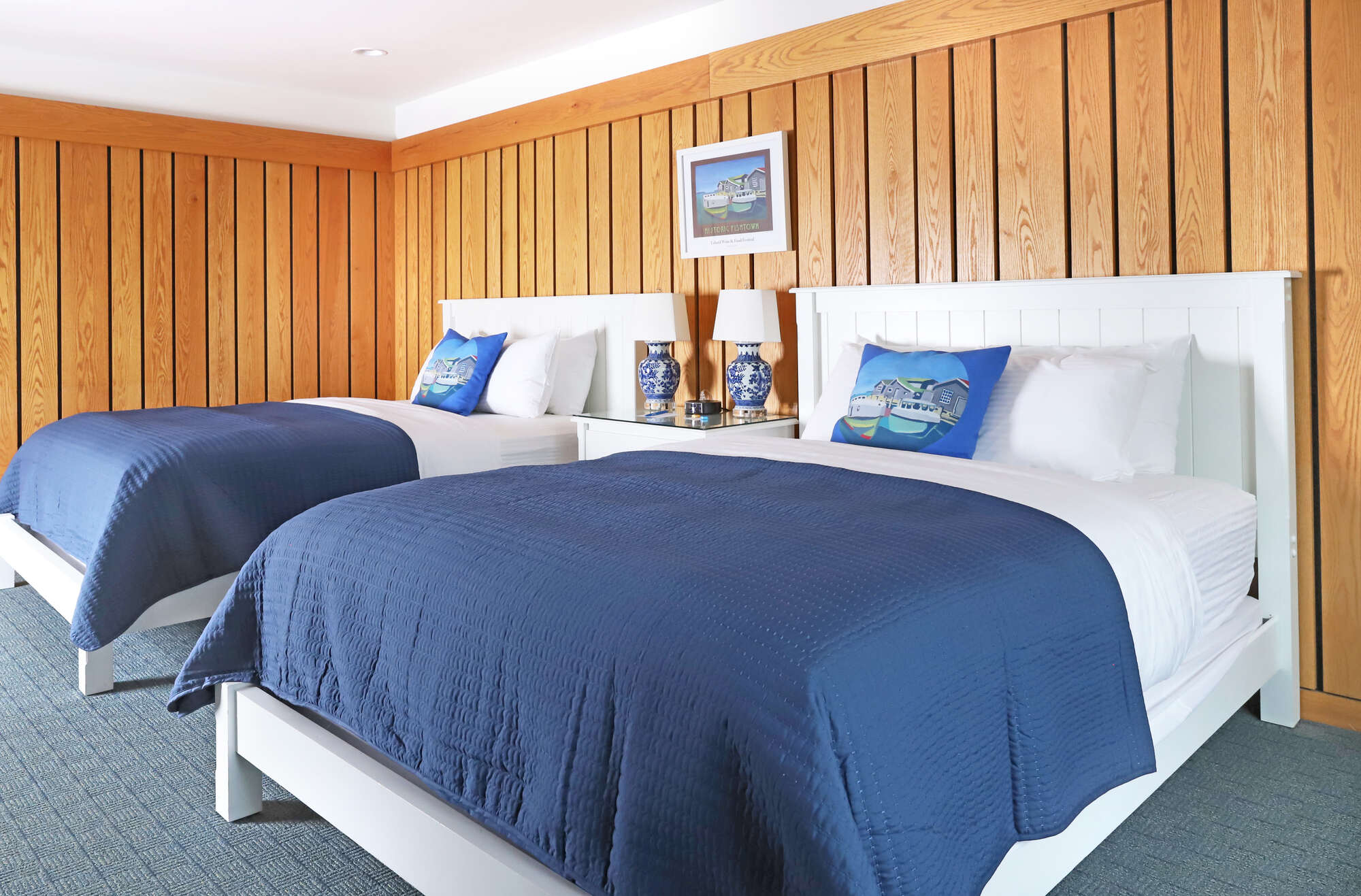 We only have three Deluxe Double Queens – they sell quickly! Two queen beds, private bath, mini-refrigerator, 32” flat-screen TV with expanded cable, Keurig® coffee maker, coffee and decaf K-pods, programmable AC/Heat control, bath robes, and Bath & Body Works® amenities. Two of the Deluxe Double Queens have two Murphy beds, overlook the historic golf course of the Leland Country Club, and offer seasonal (winter/spring) views of Lake Leelanau. The other Deluxe Double Queen has a full-size sofa, and a village view, and is the largest room at The Lodge at approximately 325 square feet. Complimentary daily housekeeping service included. All Deluxe Double Queens are on the 2nd Floor (stairs required). Accommodates a family of up to 6 persons – a maximum number of adults allowed is 4.