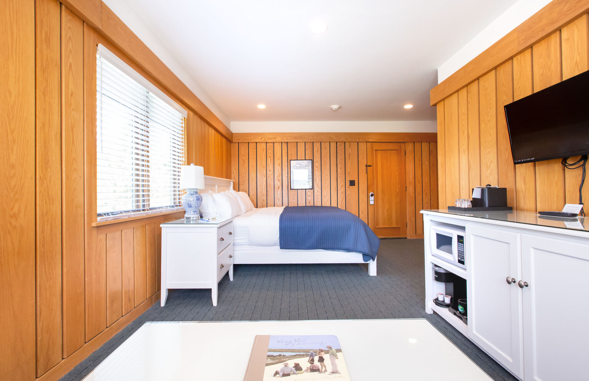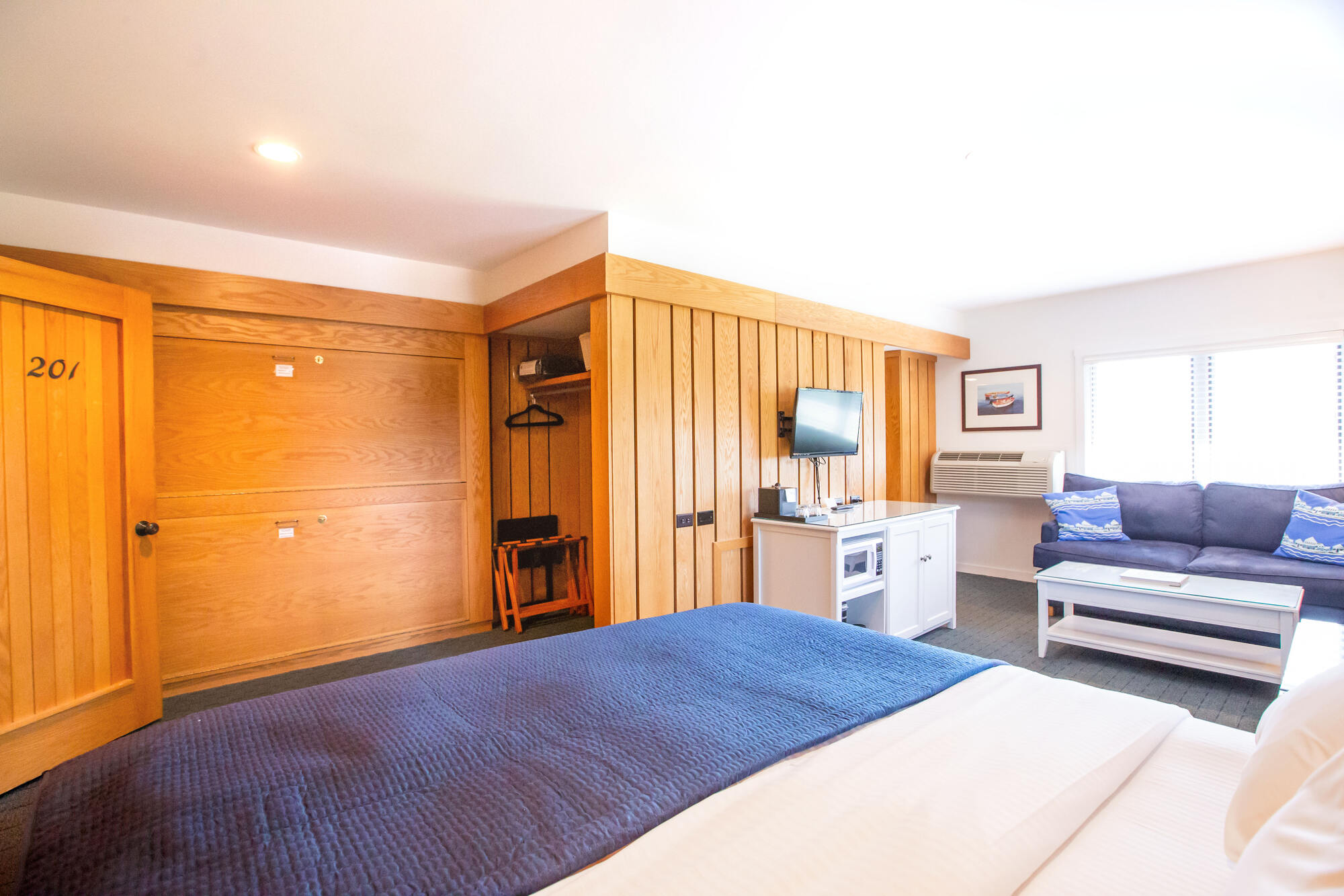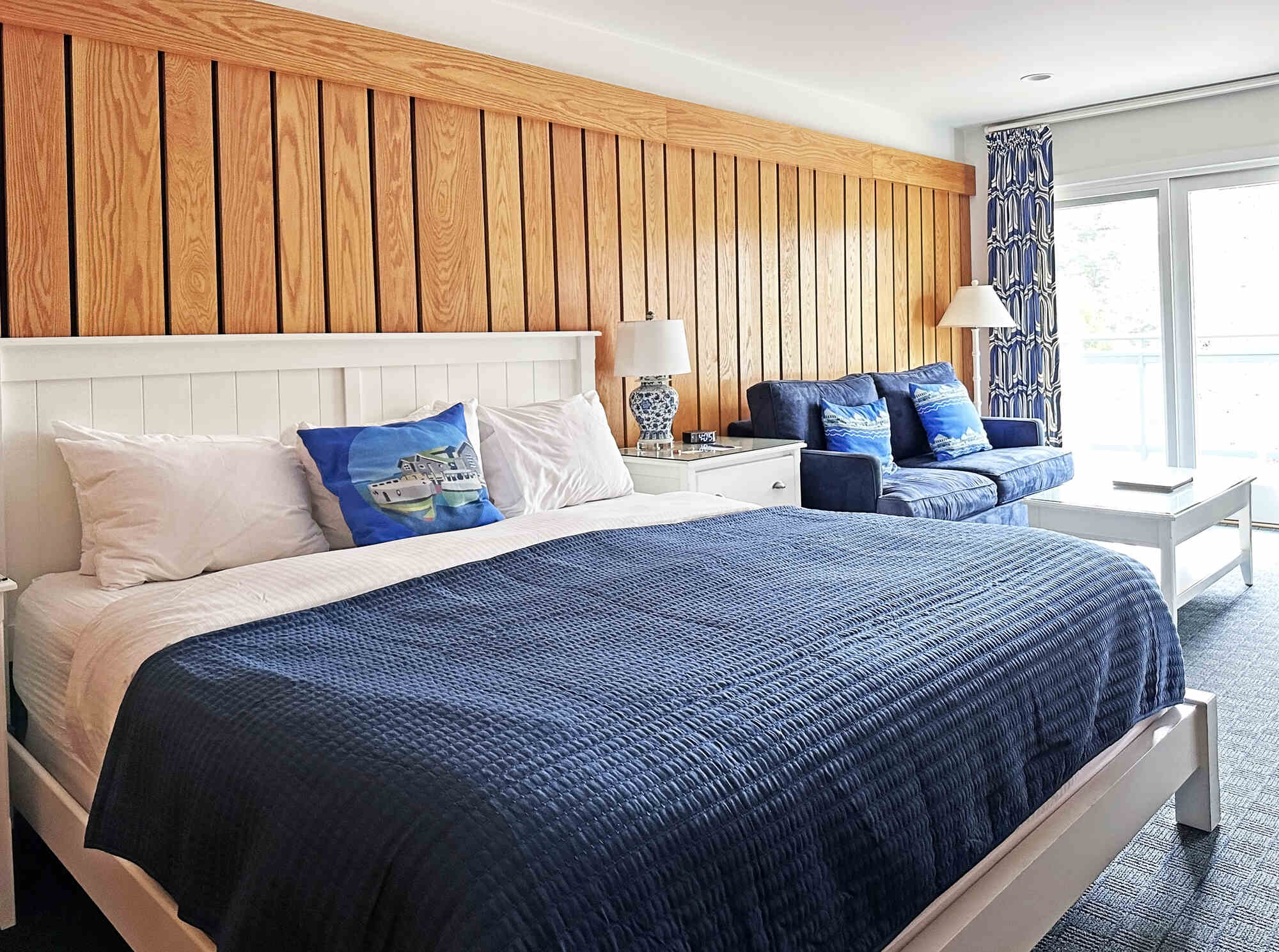 Our most popular room type and perhaps the most versatile rooms in Leelanau County. A family favorite! One king bed, two murphy beds, full-size sofa bed, private bath, mini-refrigerator, 40” flat-screen TV with expanded cable, Keurig® coffee maker, Dunkin’ K-pods, programmable AC/Heat control, bath robes, iron/ironing board and Bath & Body Works® amenities. Rooms overlook the historic golf course of the Leland Country Club or offer a shared balcony overlooking our garden courtyard. Some rooms offer seasonal (winter/spring) views of Lake Leelanau. Complimentary daily housekeeping service included. All Deluxe Kings are on the 2nd Floor (stairs required). Accommodates a family of up to 6 persons – the maximum number of adults allowed is 4.