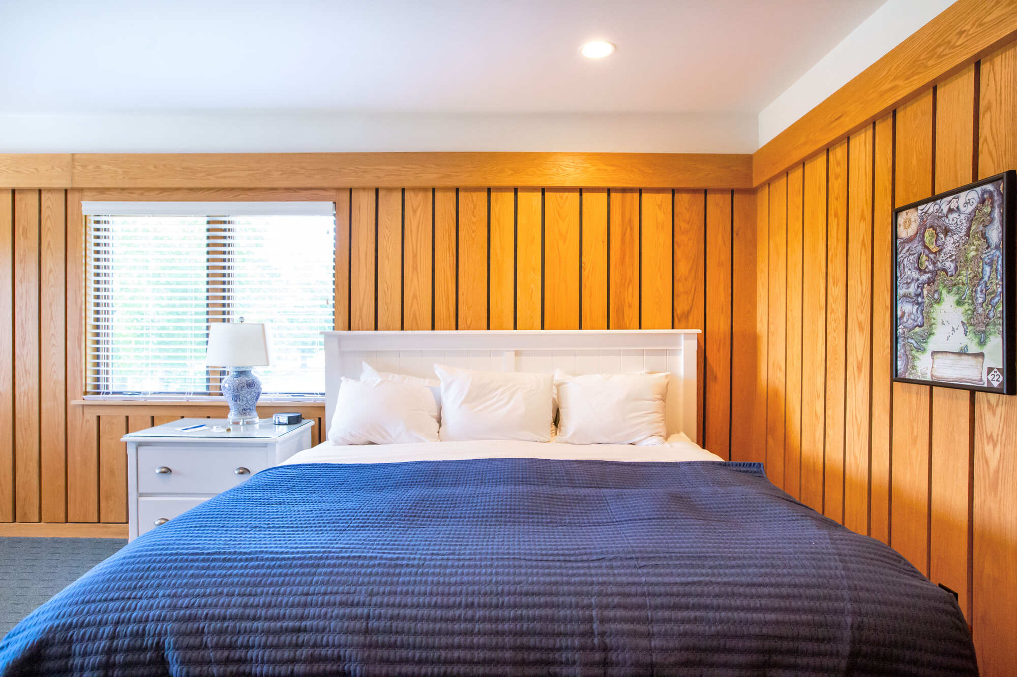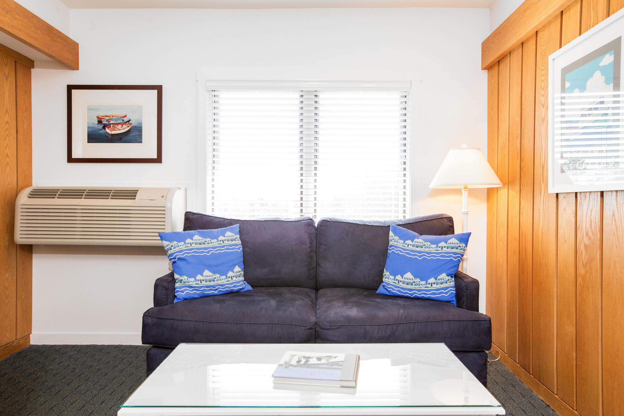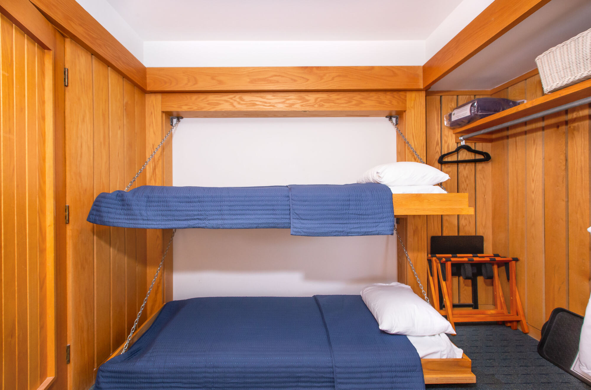 Our most popular room type and perhaps the most versatile rooms in Leelanau County. A family favorite! One king bed, two murphy beds, full-size sofa bed, private bath, mini-refrigerator, 40” flat-screen TV with expanded cable, Keurig® coffee maker, Dunkin’ K-pods, programmable AC/Heat control, bath robes, iron/ironing board and Bath & Body Works® amenities. Rooms overlook the historic golf course of the Leland Country Club or offer a shared balcony overlooking our garden courtyard. Some rooms offer seasonal (winter/spring) views of Lake Leelanau. Complimentary daily housekeeping service included. All Deluxe Kings are on the 2nd Floor (stairs required). Accommodates a family of up to 6 persons – the maximum number of adults allowed is 4.